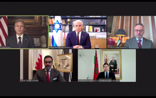 U.S. Secretary of State Antony Blinken, Israeli Foreign Minister Yair Lapid, UAE diplomatic adviser Anwar Gargash, Bahrain’s Ambassador to the U.S. Sheikh Abdullah bin Rashid al-Khalifa and Moroccan Foreign Minister Nasser Bourita in a virtual event marking the one-year anniversary of the Abraham Accords. (Screen capture/YouTube/ September 17, 2021)