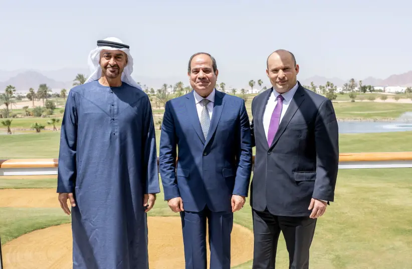 Egyptian President Abdel Fattah al-Sisi, Abu Dhabi Crown Prince Sheikh Mohammed bin Zayed al-Nahyan and Israeli Prime Minister Naftali Bennett in Sharm El Sheikh, Egypt. (UAE Ministry of Presidential Affairs/Reuters/ March 22, 2022)